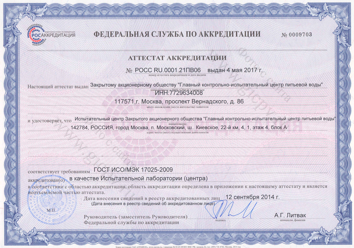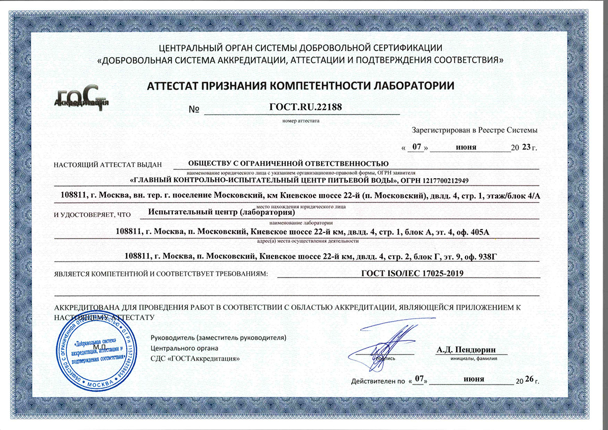 Аккредитованный ГЛАВНЫЙ КОНТРОЛЬНО-ИСПЫТАТЕЛЬНЫЙ ЦЕНТР ПИТЬЕВОЙ ВОДЫ (ООО «ГИЦ ПВ») имеет многолетний опыт работы в заявленной области и располагает всеми необходимыми для работы аттестатами аккредитации, лицензиями и сертификатами.